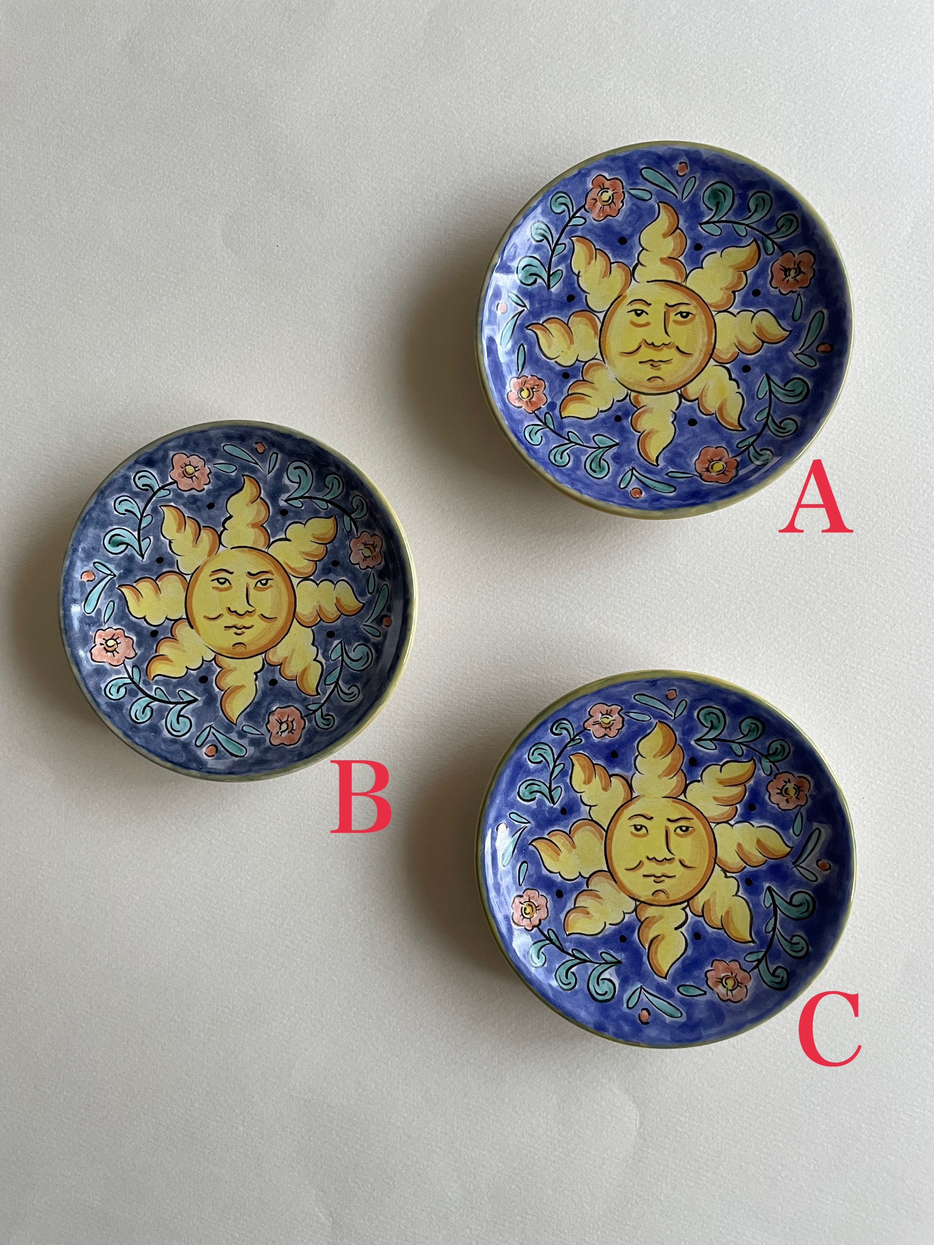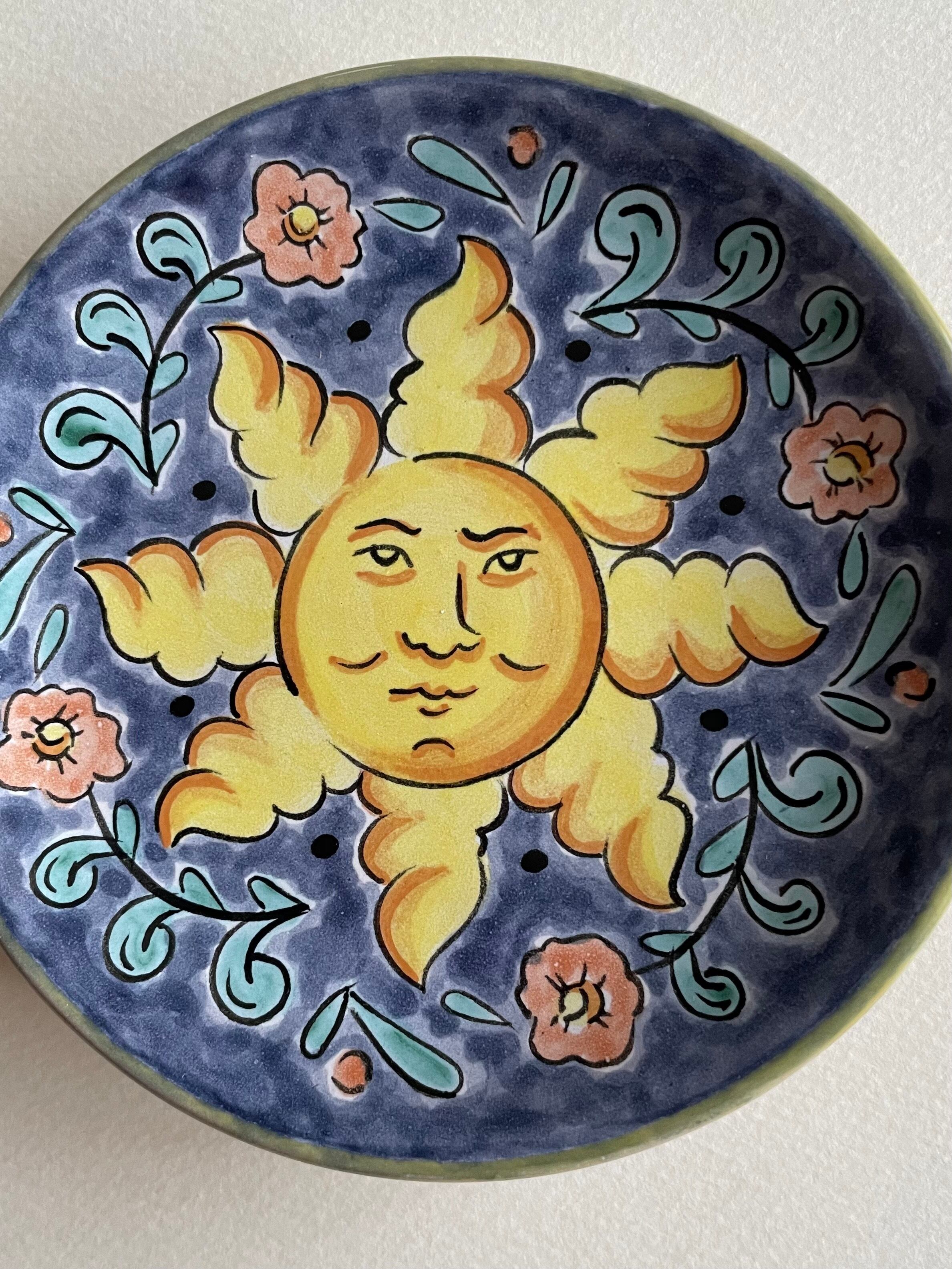 銅の緑、コバルトの青、アンチモンの黄色などマヨリカ焼きの伝統色と言われる顔料を用いて描いた太陽です。