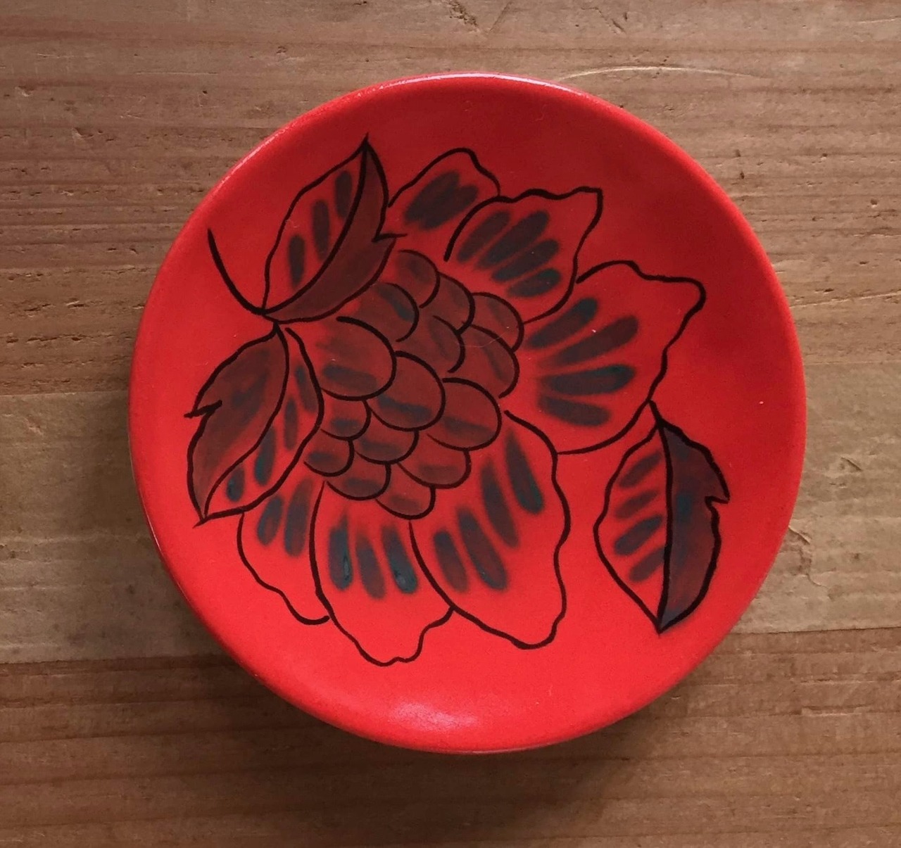 イタリアの赤釉薬に銅の顔料が反応しておこる窯変を使って表現した華です。